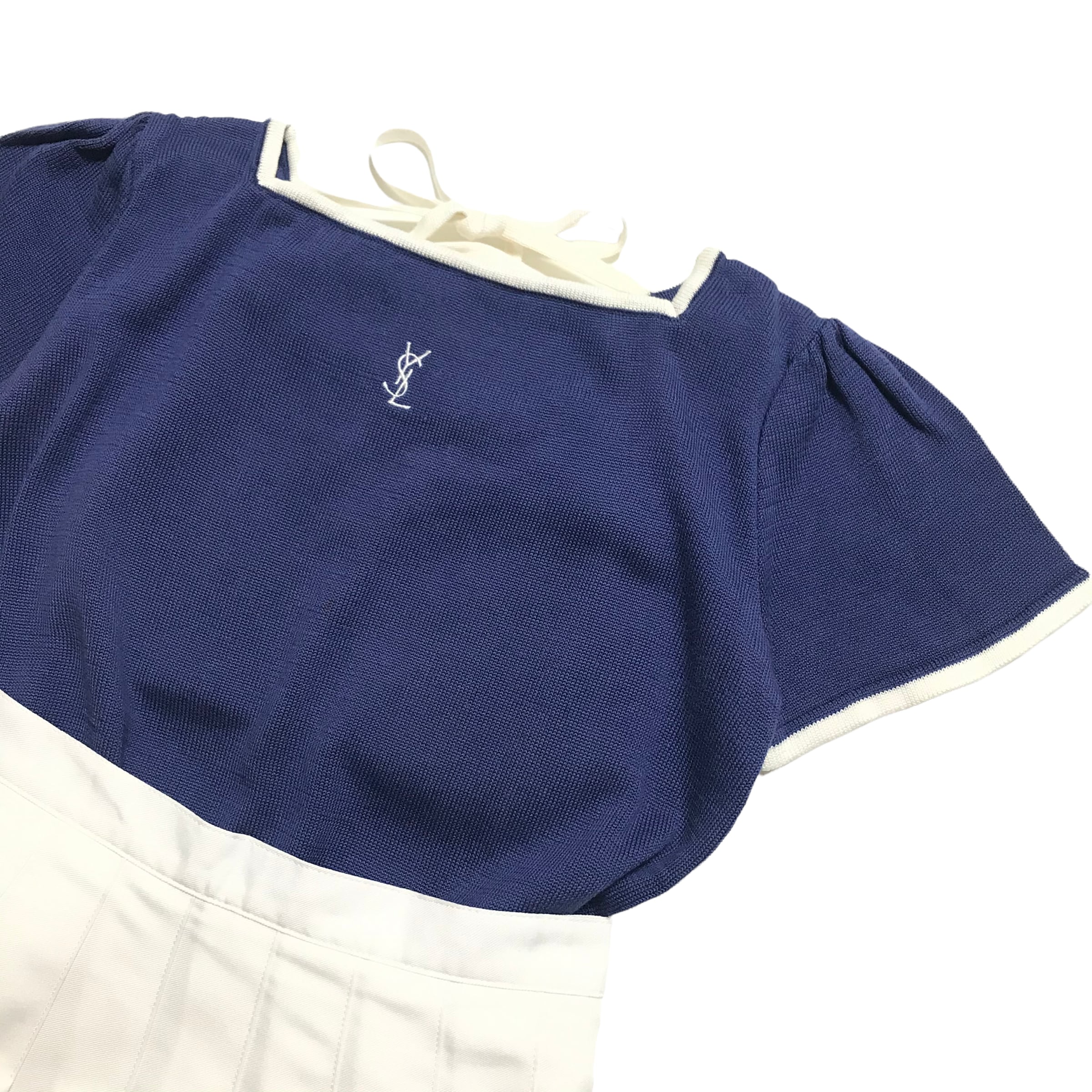 ●17006 ysl tops knit イヴサンローラン トップス 半袖ニット ライトネイビー 夏服 レディース ウィメン ヴィンテージ ユーズド 古着 ブランド服 かわいい デート デート服 カジュアル きれいめ AKUBI 通販 | AKUBI -アクビ-