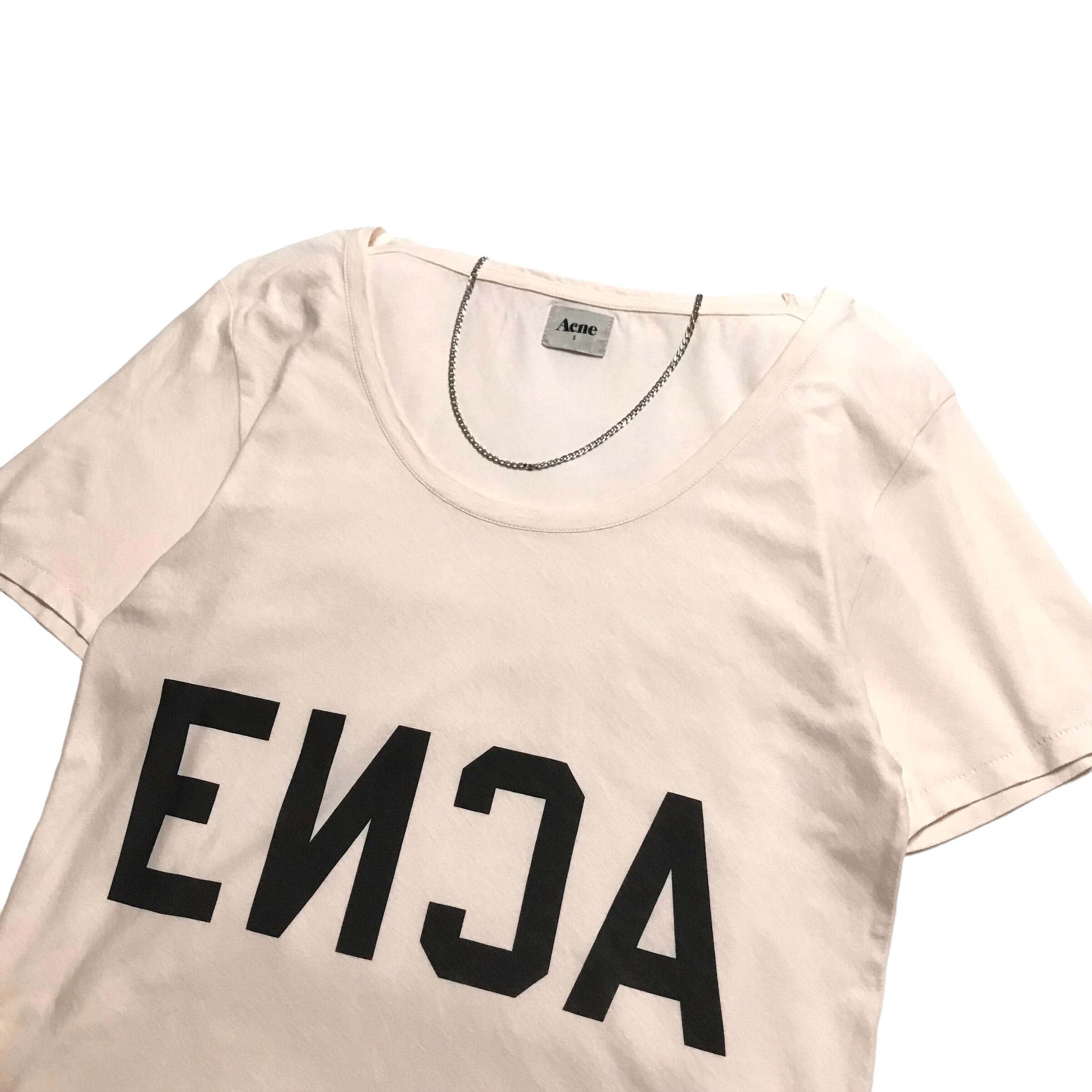 □acne初期の珍しいtシャツ。首回りが広めのデザインです。薄手の柔らかな手触りの生地。人と被らないおしゃれを楽しんでいただけると思います。