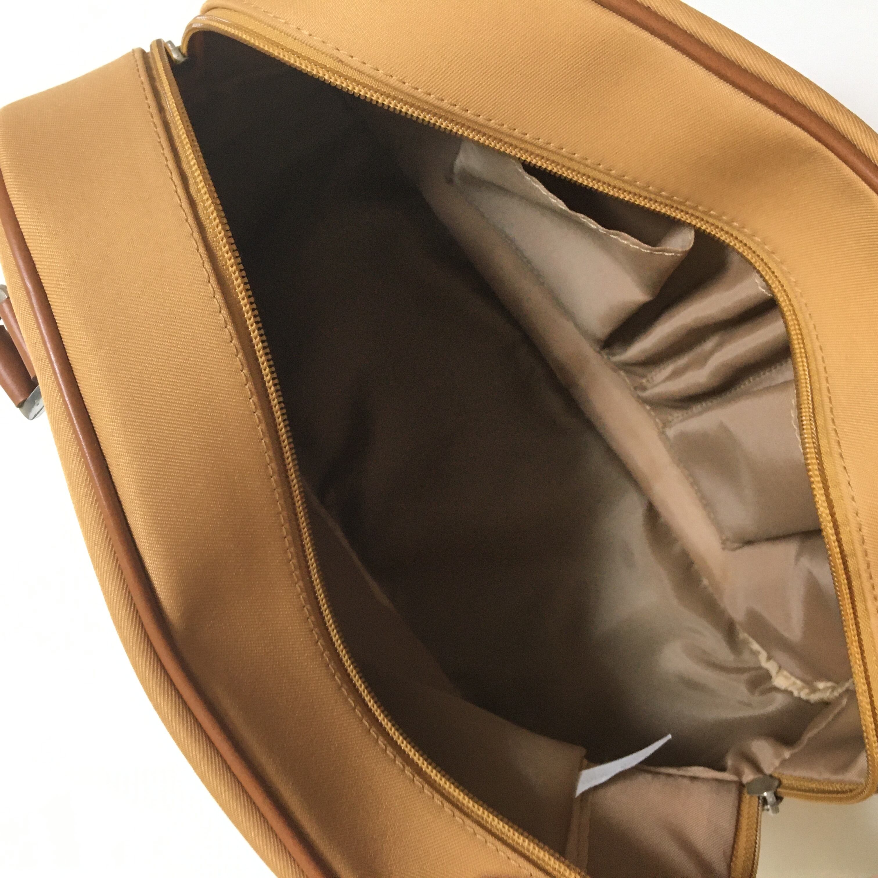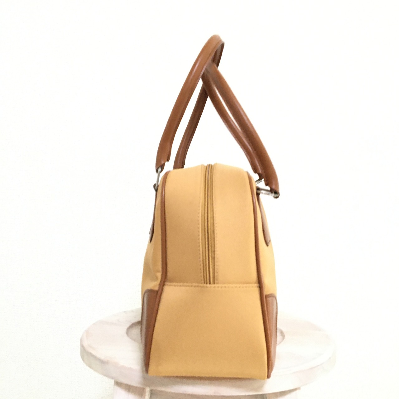 ヴィンテージバッグですので底の一か所に小さなよごれ、バッグ裏面の左角の部分に製造時の接着剤の浮きあがり(主観になりますが、光沢がある材質のため、影のようにも見えます)、取って部分の裏側の金属の小さな汚れ(裏側なので見えない箇所です)14枚目以降~