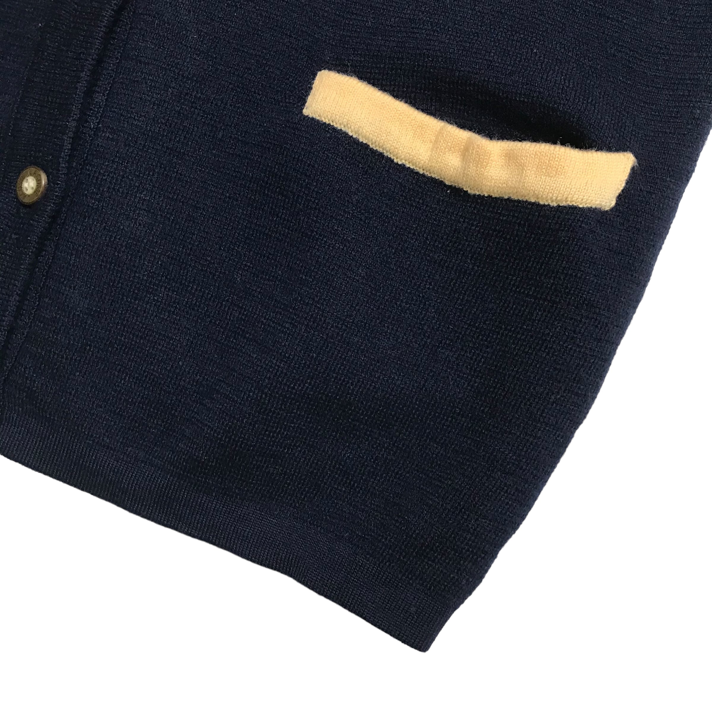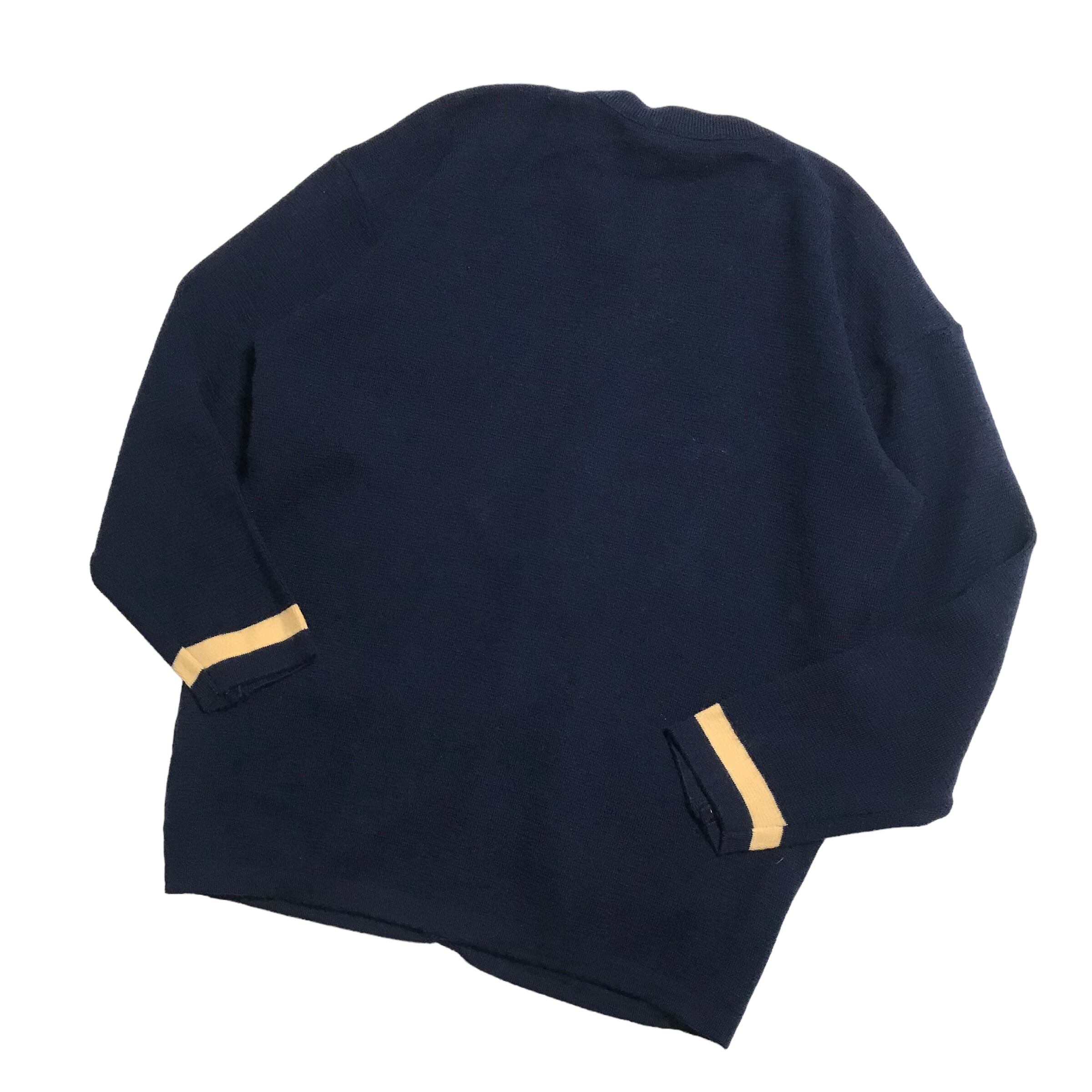 胸元のロゴと袖口やポケットの配色が可愛いです。毛100%ニット。着ぶくれない厚みです。1枚でも楽しんで頂けるかと思います。